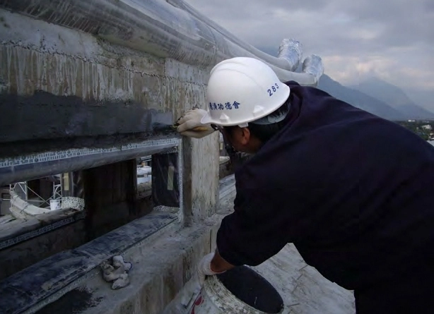 大殿三樓頂防水工程施作,劉存峰正在幫忙漆防水油漆。(攝影:陳玫君)