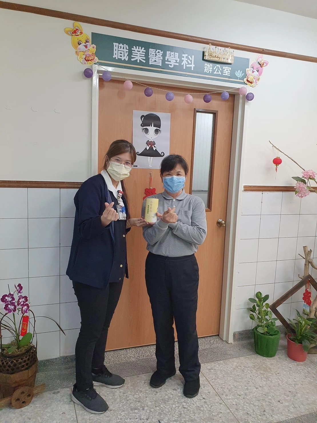 骨科的謝明宏醫師是義賣站第一位結緣的「顧客」,竹筒裡於是有了第一筆愛心款項。(左起林欣怡、廖子漪、謝明宏)
