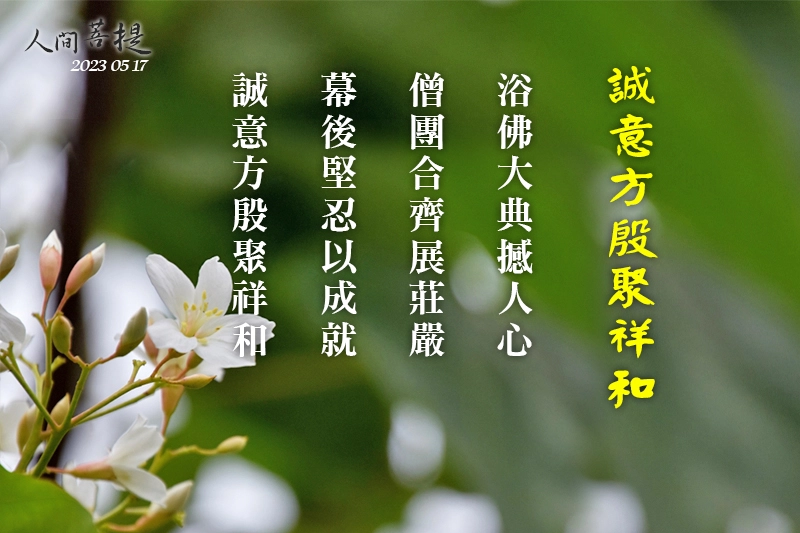 感恩來自各道場的法師共襄盛舉,他們同樣參與彩排,大家齊心一念,以最虔誠的心禮謝佛恩與祝禱,這一股愛的能量是浴佛典禮最動人的畫面。此外,慈誠志工為了將一幅「佛陀灑淨圖」布縵高掛在紀念堂的其中一道門,他們不但費心修整布縵,還爬上好幾米高處將高約十五公尺、寬十公尺,重量達兩百公斤的布縵拉上去掛好,真教人感動!