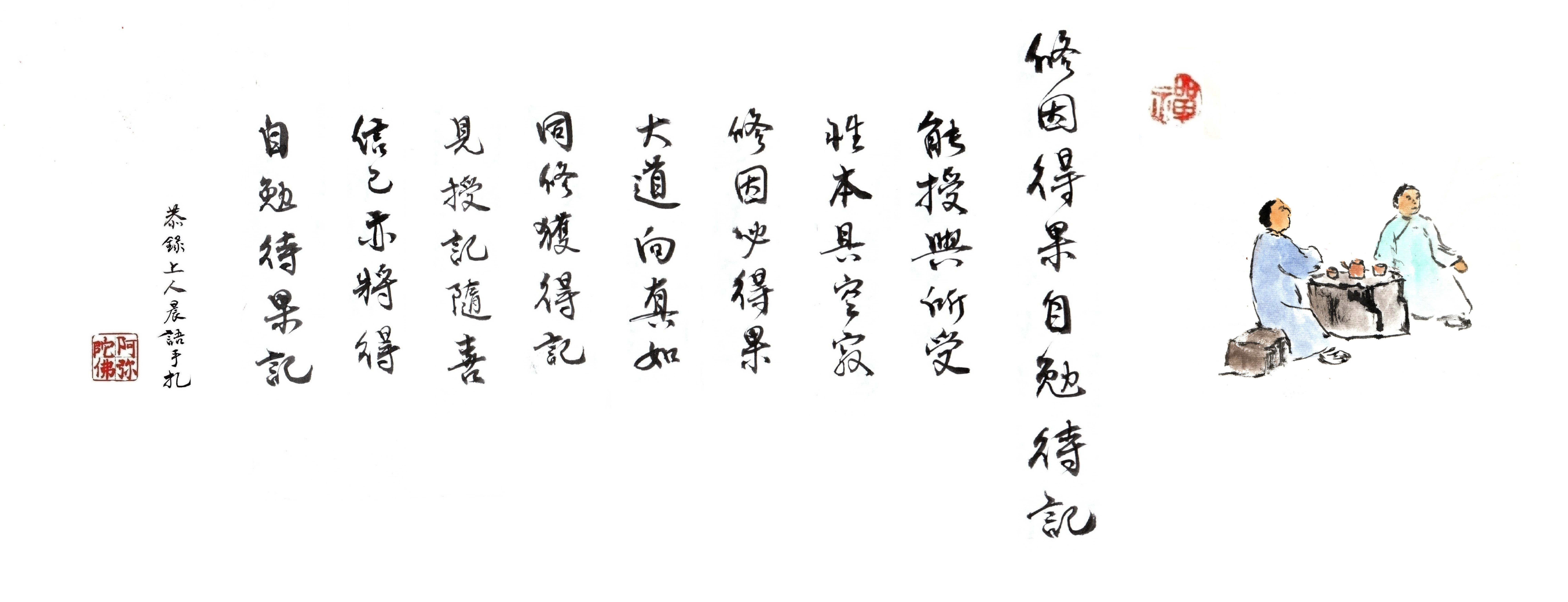 我們帶著這個業,隨著因緣果報,由不得自己。「修因必得果」,如是因、如是緣、如是果報。「大道向真如」,我們所修的大道,要走向真如。真如才是我們的方向,要回歸真如本性,一定要認真撥開煩惱纏。「同修獲得記」,大家一起來修行,一起蒙佛為我們作證。