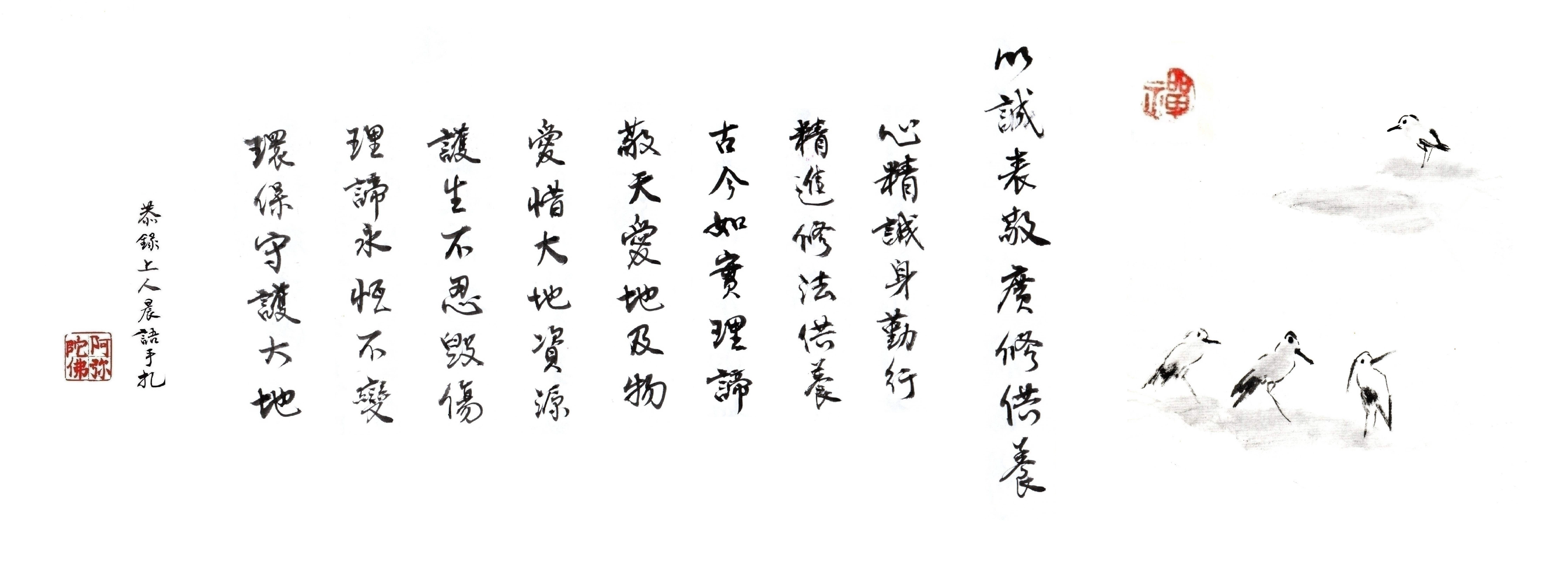 「理諦永恆不變,環保守護大地」,用環保守護大地,這就是永恆不變的道理。要護生,以佛心愛護眾生。因為佛陀來人間,是為了要救度眾生,還要學會護生,不忍心去傷殺牠,所以非素不可。