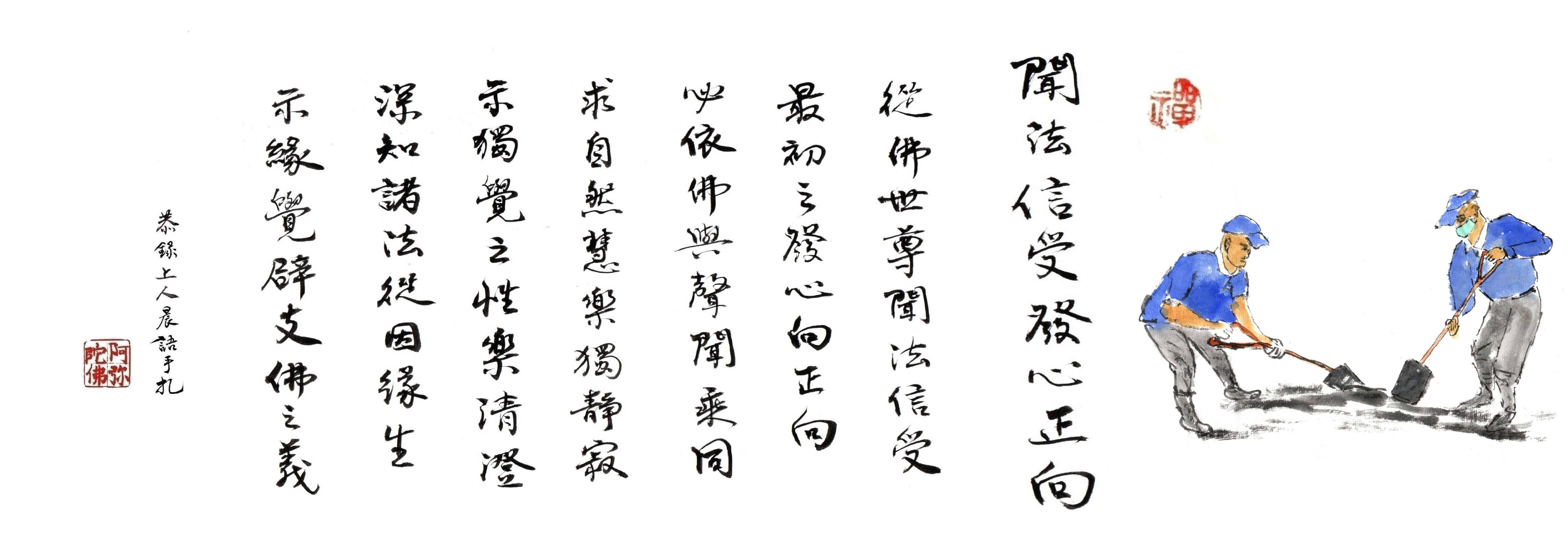 「最初之發心向正向」,開始初發心,我們的心就要對準正方向,方向正確,不能偏差。「必依佛與聲聞乘同」,要修得通往佛的道路,我們必得依循規矩一步步走上這條菩薩道;聽聲音入耳根來,我們要不斷地用心,不與法脫軌,身體力行,「求自然慧」。
