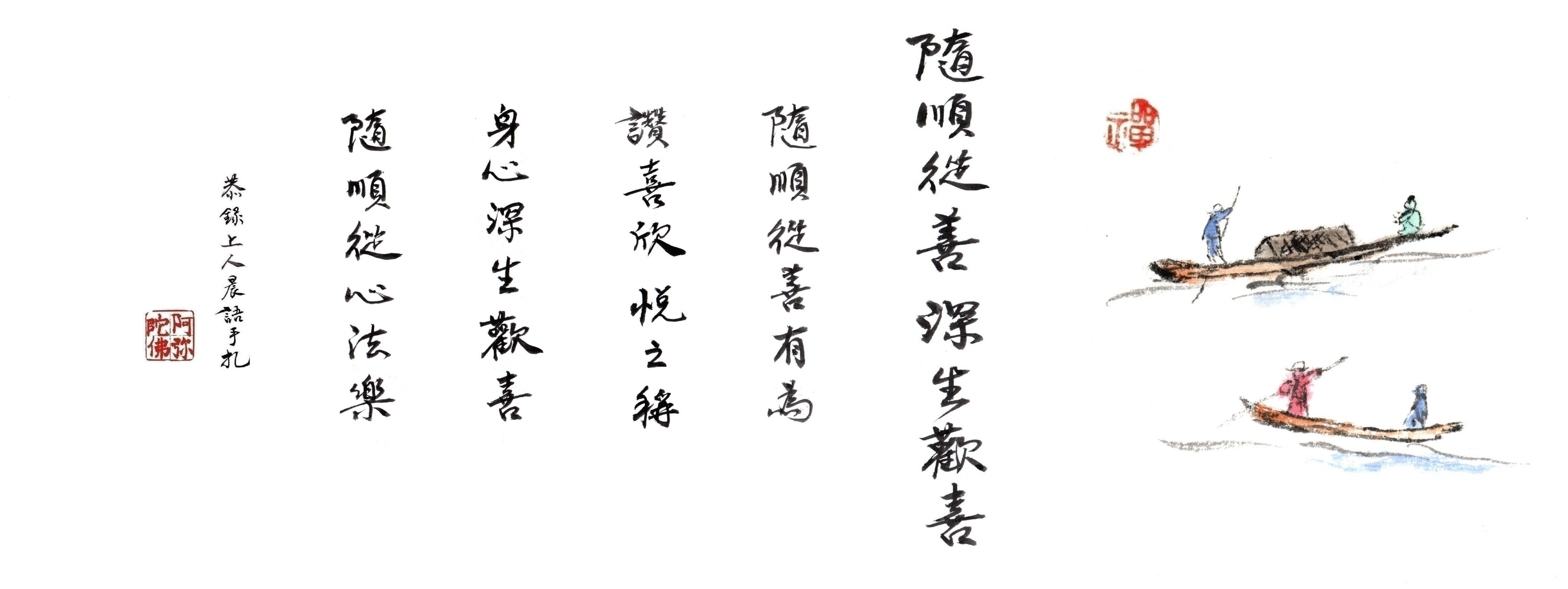 「身心深生歡喜」,自己隨順從善,該做的去做,大家來為我們隨喜功德。而我們也很歡喜,「隨善從心法樂」。聽法、用法,隨喜幫助法去流傳,讓人人得法,就能沐浴在法流中。這都是很歡喜的事情。