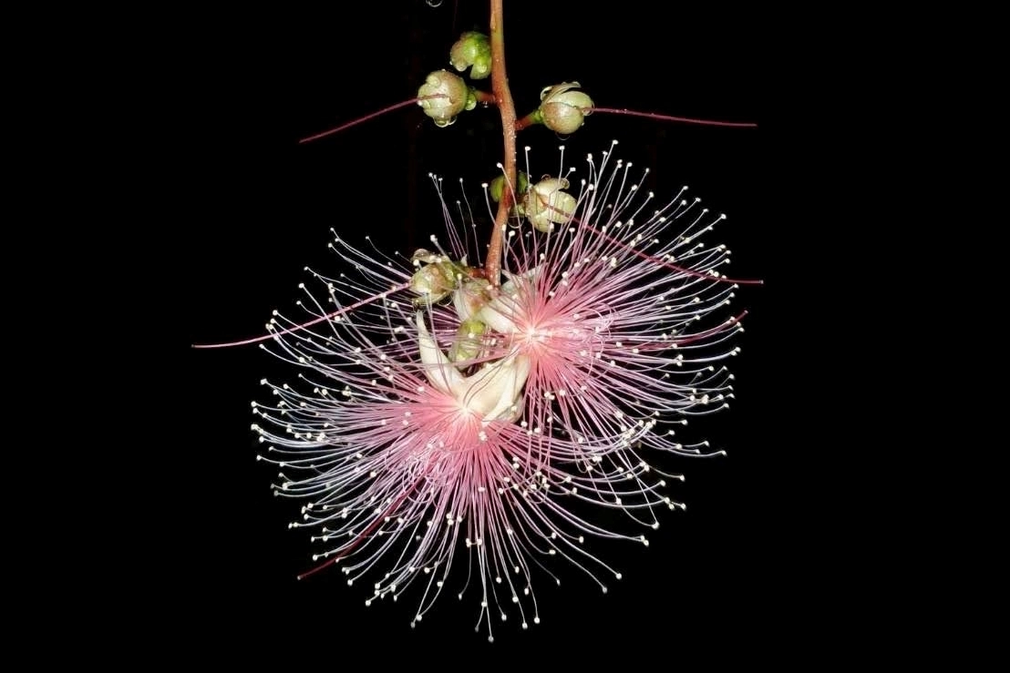 穗花棋盤腳是種很迷人的花,一串串如同珍珠簾子,只在夜間開花,就像曇花一樣。但它跟曇花有不一樣的美,像粉撲、像煙火。