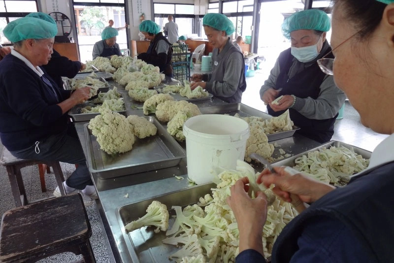 從白花椰菜過剩,到志工削薄片的辛勤,再到惜福花椰菜梗的料理,這段過程串起了許多珍貴的因緣。(攝影:劉志銘)