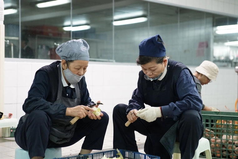 香積志工不浪費食材,細心削花椰菜梗,將菜梗切絲做涼拌,變成一道可口菜餚。(攝影:廖嘉南)