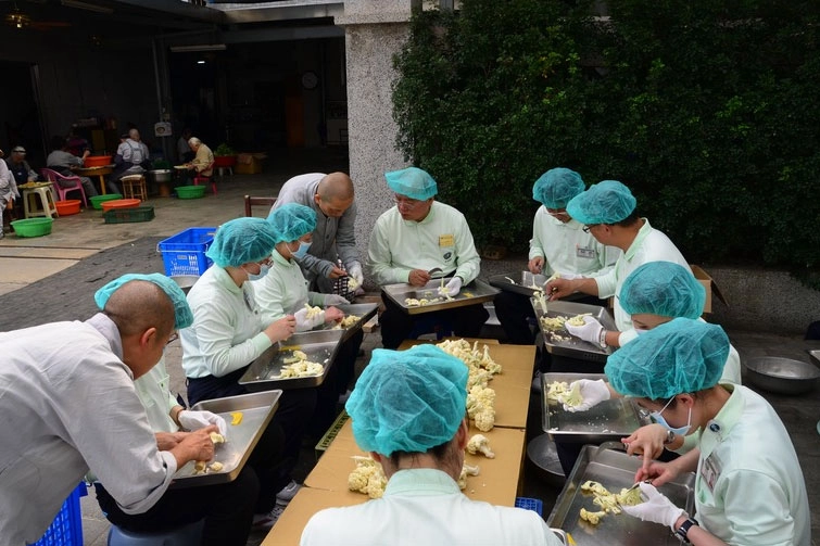 現場,常住師父及志工們各自找好位置,拿著小彎刀坐在板凳上,默默地專注於手上的工作。