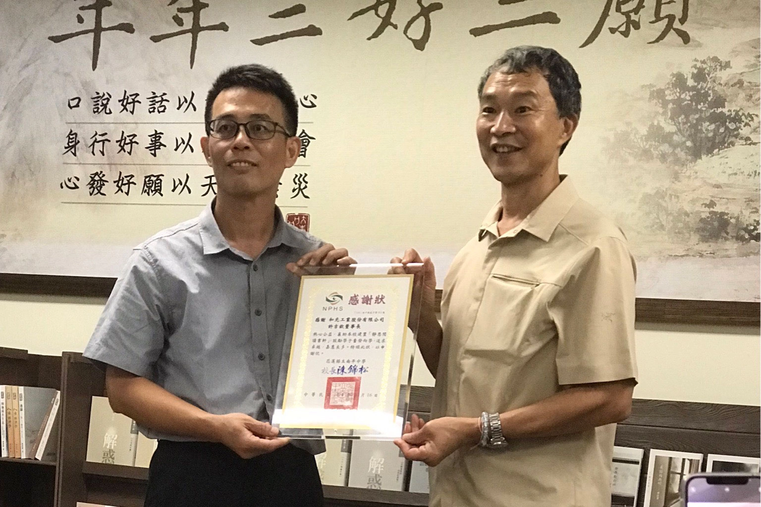 南平中學陳錦松校長(左)致贈感謝狀給捐贈人許吉欽先生(右)。(圖片來源:陳美羿提供)