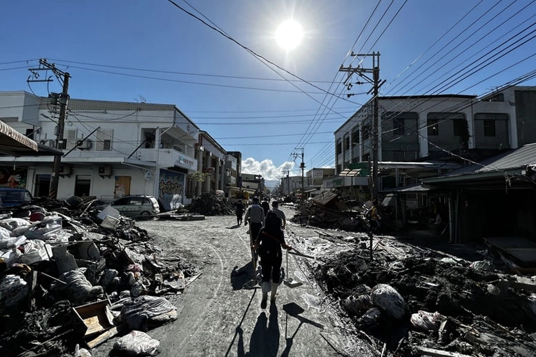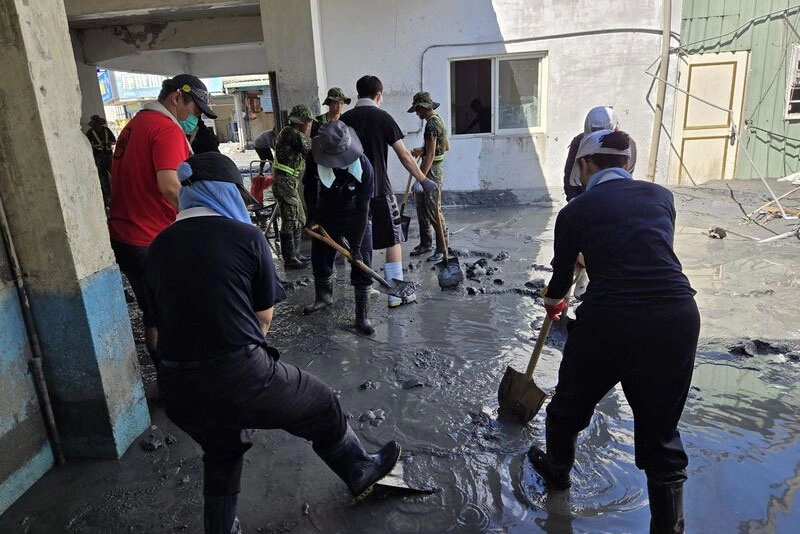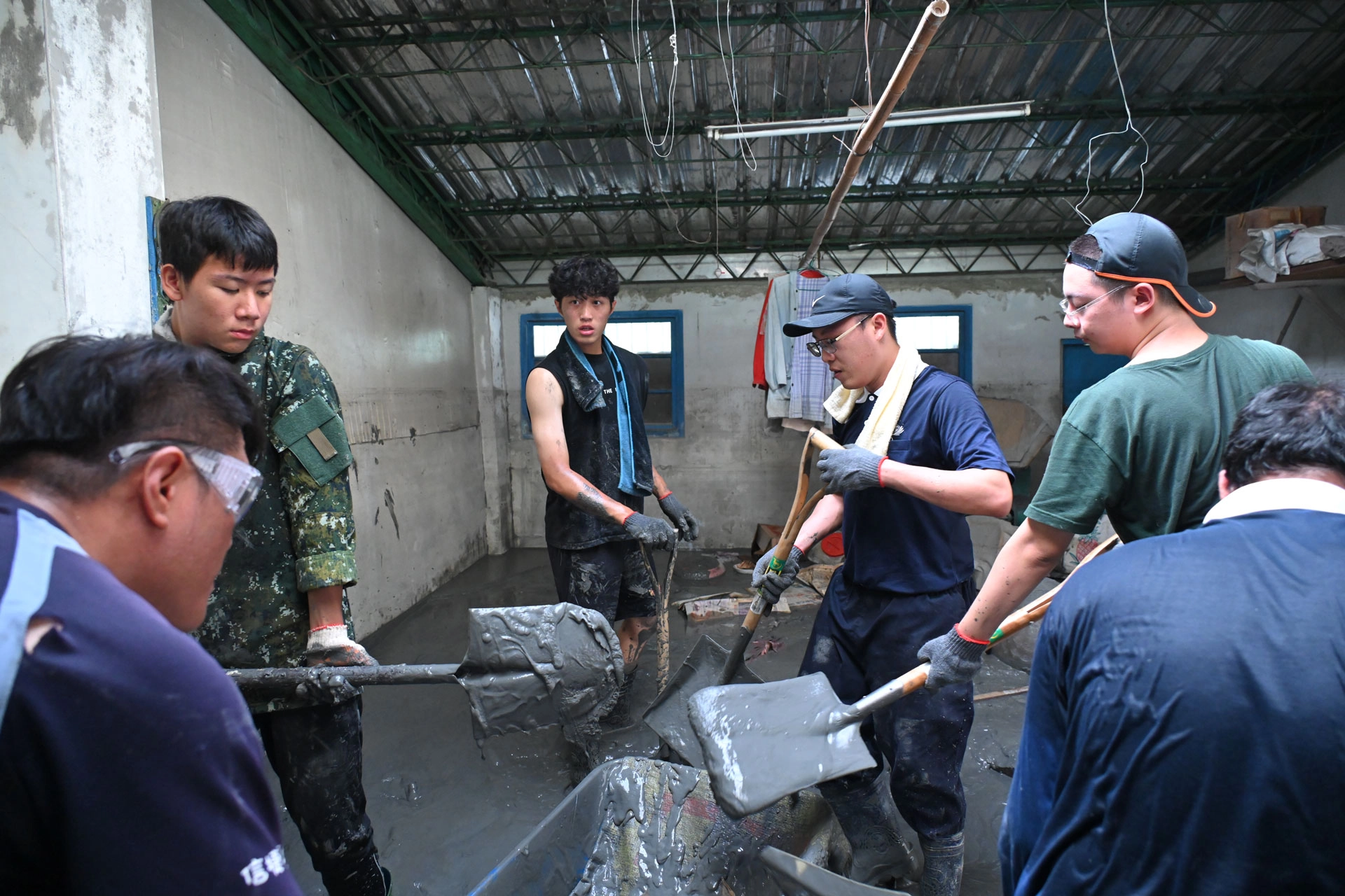 早上,他們在中正路一帶協助金紙店與免洗餐具店。店門鐵門拉起,泥線像年輪刻在牆上,告訴人們水位曾經到過那裡。