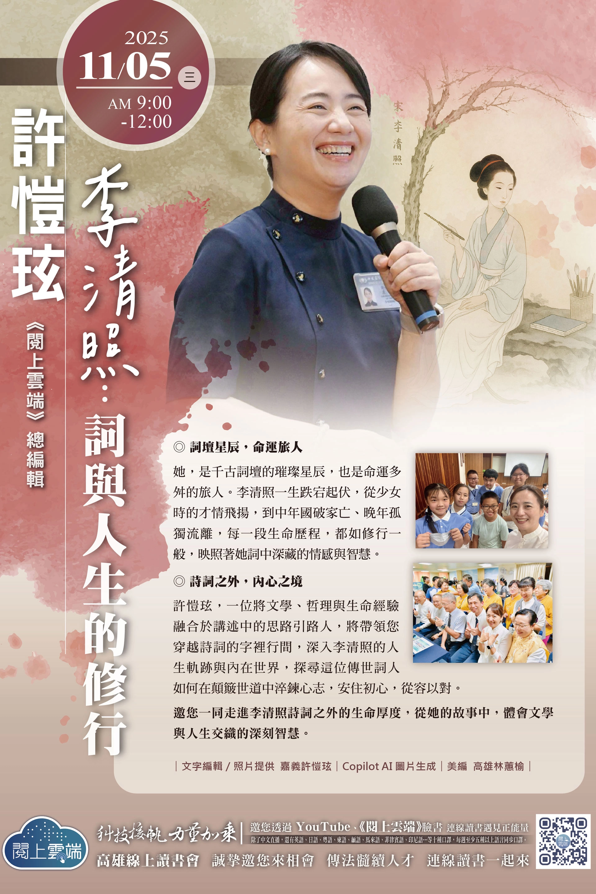 2025年11月5日,我到高雄線上讀書會進行一場題為「李清照:詞與人生的修行」分享,大家彷彿跨越時空與李清照對話,是古人與今心在雲端相會。
