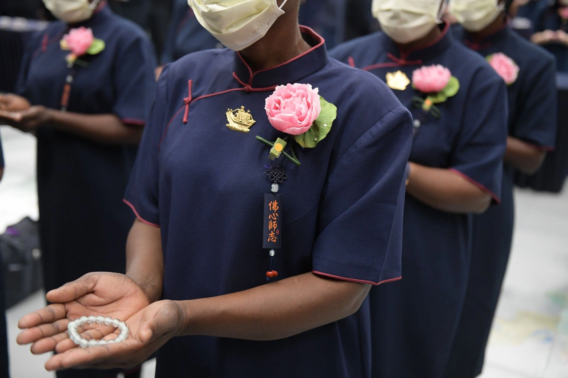 新受證慈誠委員胸前掛著「佛心師志」,發願跟隨上人承擔如來家業,拔苦與樂。(攝影:周幸弘)