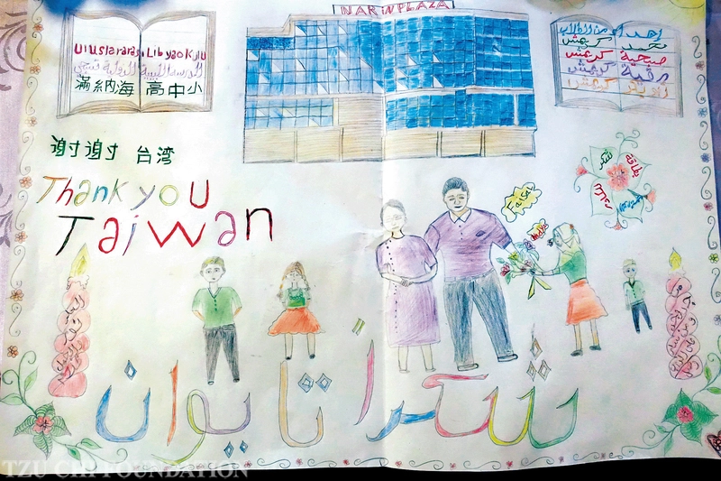 滿納海學校難民學童的畫作,他們發願長大後要和慈濟人一同助人。畫上寫著「謝謝台灣(Thank you Taiwan)」。(2017/12/09圖片來源:土耳其聯絡點)