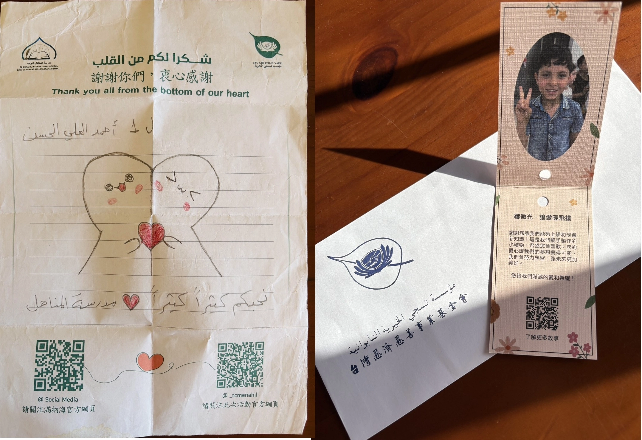 在這張A4紙上,孩子用鉛筆寫了我看不懂的阿拉伯文,並在紙的正中央,畫了兩個好可愛的卡通娃娃。娃娃的臉上,都有著可愛的表情,其中一個娃娃有發亮的眼睛,另一個娃娃則是開心的笑瞇了眼。兩個娃娃的身體是緊緊靠在一起的,各伸出一隻手,共同捧著一顆愛心。我拿出手機,用google翻譯信上的阿拉伯文,原來這孩子在左上角寫了自己的名字,右下角寫著:「我們非常愛你」。