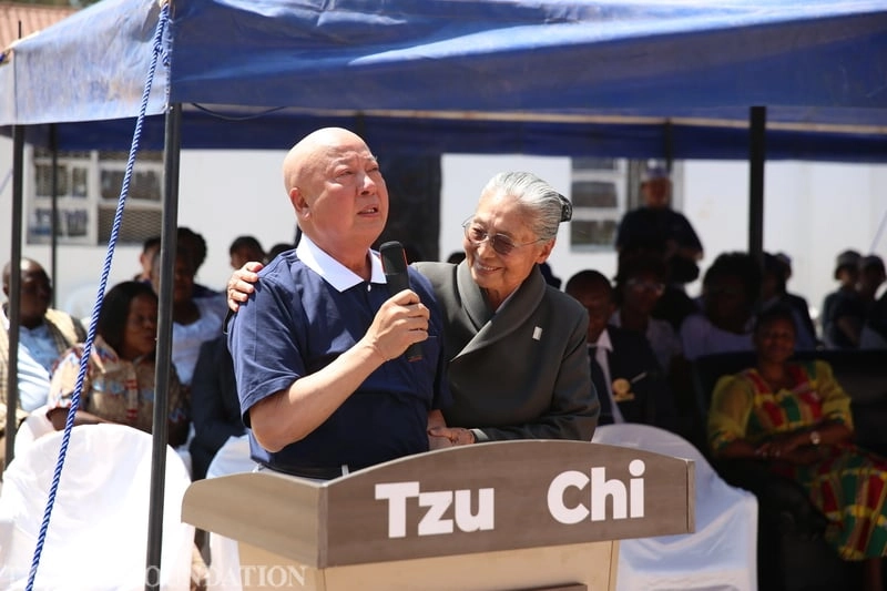 辛巴威哈拉雷慈濟園區動土典禮,朱金財(左)一上臺就激動得說不出話來......林靜憪副總執行長(右),快步走到講桌,手拍著他的肩安撫著。(2025/09/07攝影/詹進德)