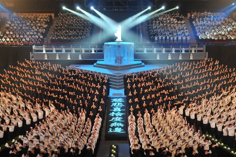 高雄巨蛋《靜思法髓妙蓮華》經藏演繹,在「優人神鼓」莊嚴緩步的引領下,伴隨《爐香讚》揭開序幕。(2022/12/10;攝影:許翠卿)