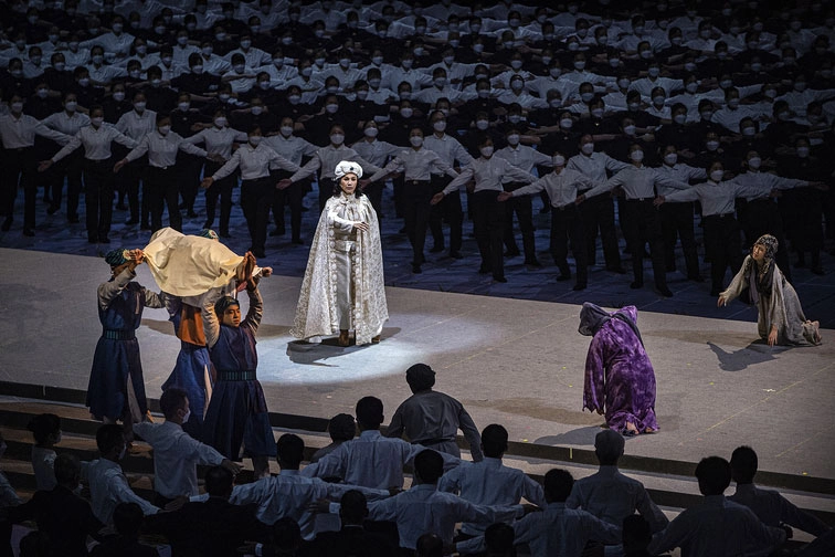 高雄巨蛋《靜思法髓妙蓮華》經藏演繹中,唐美雲歌仔戲團詮釋悉達多太子出宮見生老病死而立志求道,志工以肢體動作映現心境、烘托氛圍。(2022/12/09;攝影:黃筱哲)