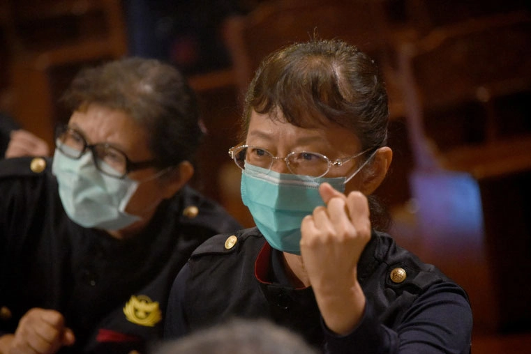 高雄靜思堂歲末祝福暨授證典禮前置作業《窮子喻》彩排中,王慧玲師姊(右)退休後自北部返鄉高雄定居,並參與法海區演繹。(2021/12/15;攝影:施純純)