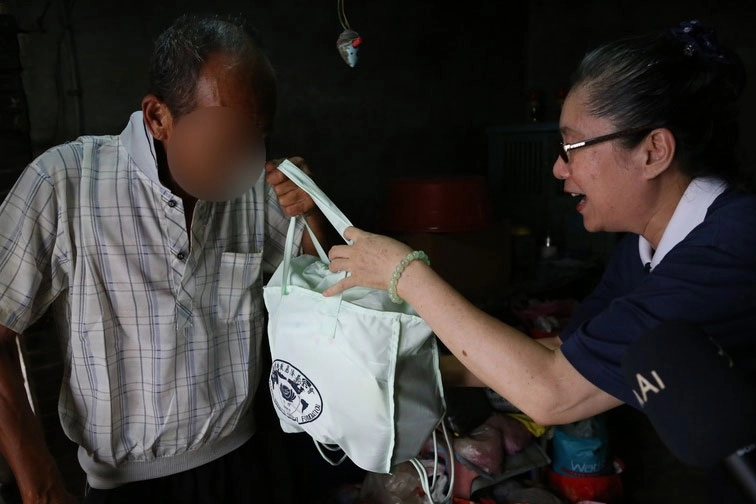 因應蘇迪勒颱風來襲,周守一師姊送上物資給案主葉先生,以備不時之需。(2015/08/07;攝影:蘇文法)