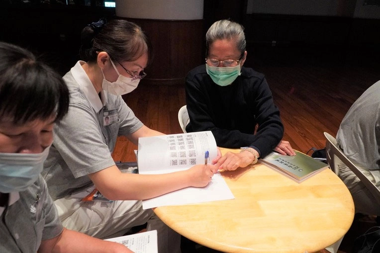 雲嘉南區慈誠委員培訓課程於臺南靜思堂舉行,資深訪視志工周守一師姊(中)心繫訪視志業的傳承,抱病體承擔桌長,指導培訓學員畫家系圖。(2021/04/18;攝影:李美伶)